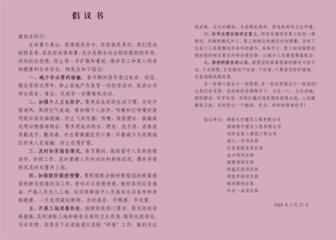 生命重于泰山,疫情就是命令,防控就是責(zé)任,于1月27日上午我公司領(lǐng)頭向祁陽縣各建筑企業(yè)發(fā)出了倡儀書。