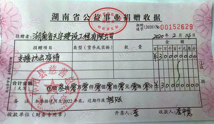 為感恩并回報(bào)社會(huì)和人民,奉獻(xiàn)企業(yè)愛心和擔(dān)當(dāng),2月13日,我公司向祁陽縣慈善總會(huì)捐款30萬元用于抗擊新型肺炎疫情。