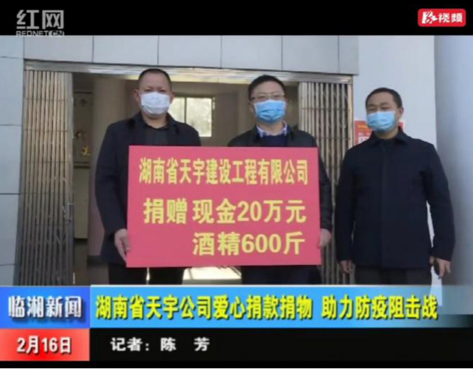 2月16日,我公司向岳陽臨湘市慈善總會(huì)捐款20萬元、酒精600斤助力抗擊新型肺炎疫情。
